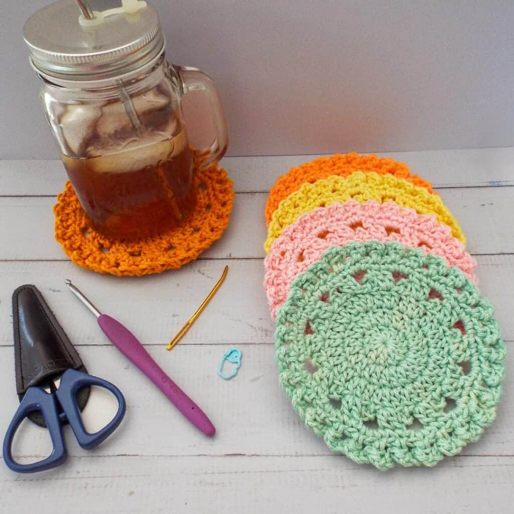Crocheting coasters is suuuuper easy and fun to make. The fact that you just need small amounts of yarn makes it the perfect way to use up your stash! These are great crochet projects that are quick to finish. These pieces can be made in various vibrant colors, making them ideal for spring and summer home décor. Also, they make great gifts that won’t break the bank or take weeks to complete! 🙂