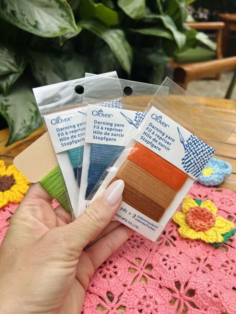Whether you’re looking to add a whimsical touch to a finished project or breathe new life into something worn, Clover’s Darning Yarn is a wonderful addition to your toolkit. You can embellish, repair, or do both at once—just like I did here! 🙂