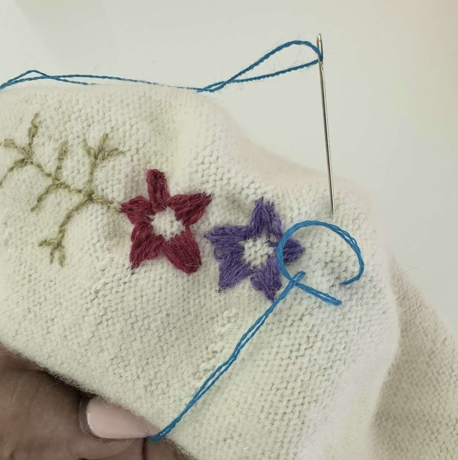 First, cut a length of darning yarn & thread it onto an embroidery needle. Adjust the thickness by using 1–3 strands, depending on how bold or delicate you want the stitches. I used 2 strands & it was perfect. Use simple embroidery stitches like the Lazy Daisy for petals, French knots for flower centers, & backstitch or stem stitch for stems & leaves. Finish off by knotting the yarn securely on the backside & trim excess.