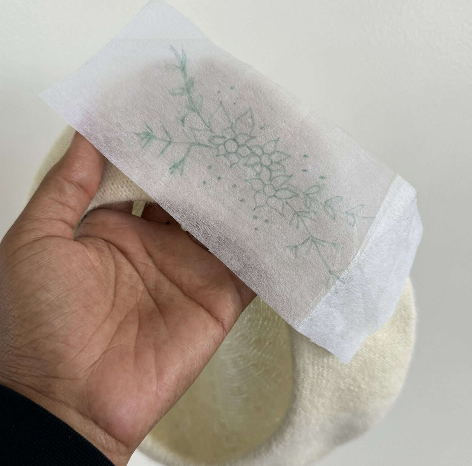 When preparing the beret for embroidery, I drew a simple flower design that I wanted to put on my beret. You can always put it inside the beret and trace with the thread from the inside or you can freestyle. I did a bit of both!