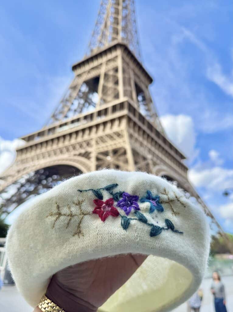 There’s nothing quite like Spring in Paris. As I travel to Paris this season, I wanted to bring a bit of that Parisian charm into my wardrobe, starting with a popular accessory, the beret! The weather in Paris is not too hot and not too cold, which makes a beret the perfect transitional piece for the weather. I hand-embroidered my beret using Clover’s new Darning Yarns 🙂 Traditionally, it can be used to repair worn-out areas of knits and crochet items, but it’s also perfect for embellishing any simple accessory in your closet that you want to upcycle. The yarn is also very lightweight so the embroidery doesn’t feel bulky. But it’s also much stronger than regular thread, which is why it has the perfect sturdiness for this project. There’s so much you can do with it and that’s what makes it so special.