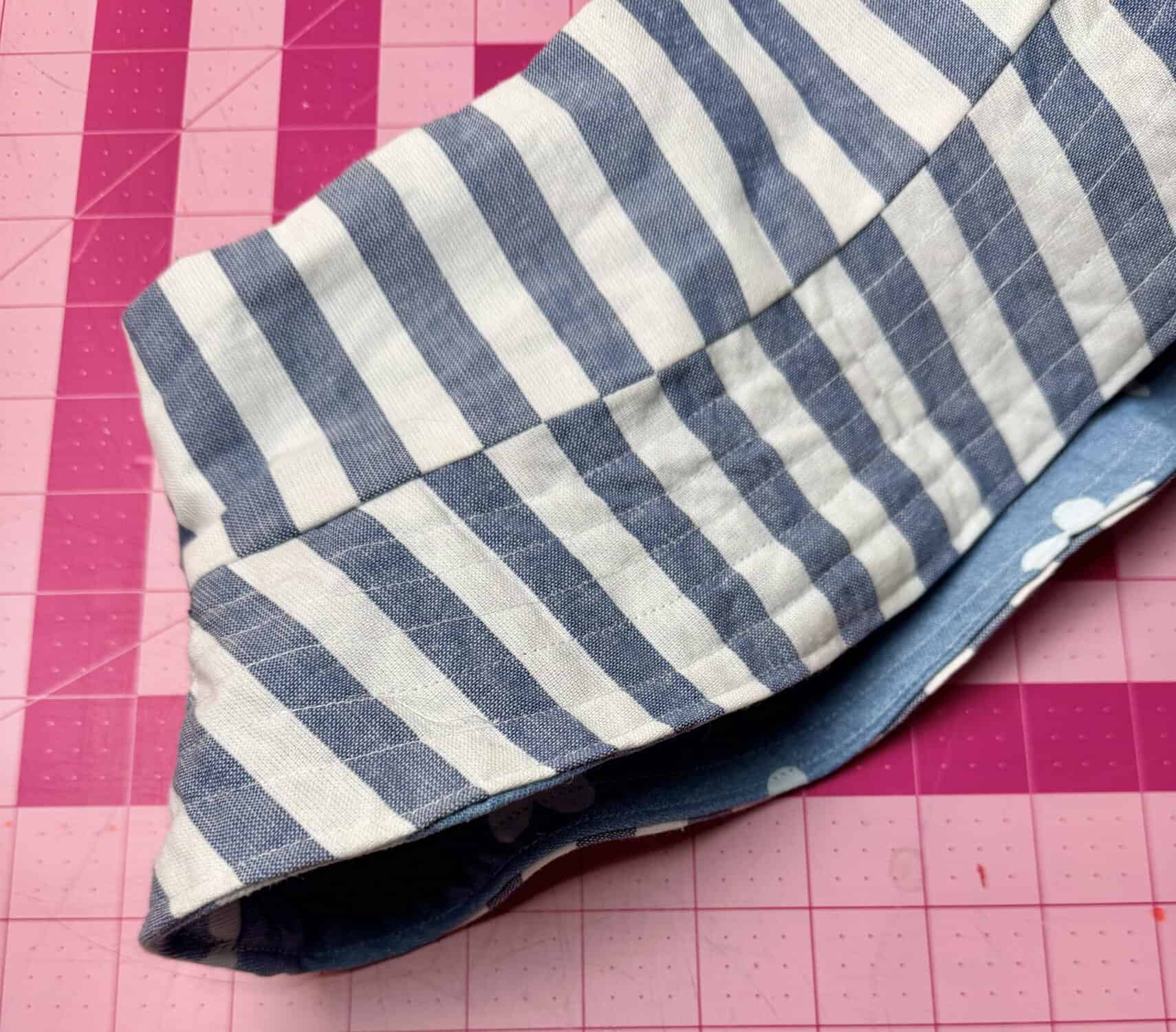 STEP 4: Turn the hat right sides out. Press. Fold in the brim 1/2” and press. Stitch along the edge and around the entire brim. Do about 5-6 more evenly spaced lines to finish off the brim. Press the entire hat and you are done! You can reverse it to whatever side to choose to use at the moment.