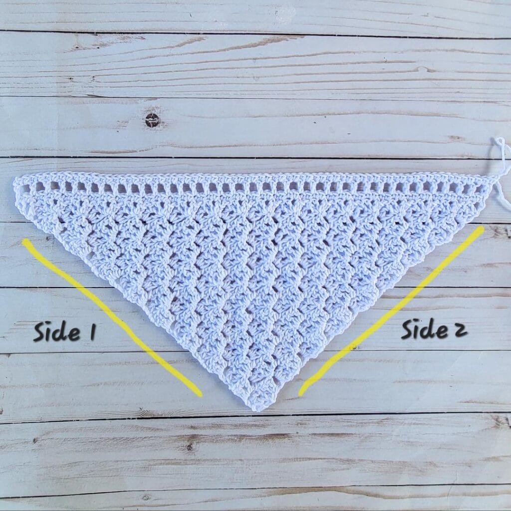 - Step 3: Side 1 of the Triangle. 1SC into the last st of Row 21 (the last st of white yarn), *sk next ch-sp, (1DC, ch3, 1DC) in next st, sk next ch-sp, 1SC in next ch-sp; Rep from * to last ch-sp (DC of first block of Row 1), sk next ch-sp, (1DC, ch3) 3 times into last st (the corner/center of the bandana), add another 1DC into the same st. Side 2 of the Triangle. **sk next ch-sp, 1SC in next ch-sp, sk next ch-sp, (1DC, ch3, 1DC) in next st; rep from ** to last st of Row 21, sk next ch-sp and 1SC in last st of Row 21.