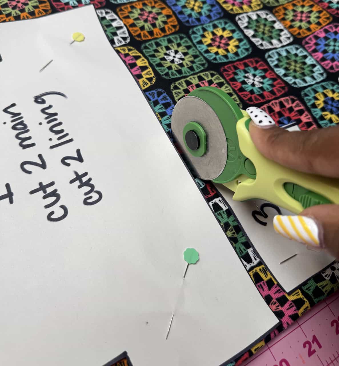 1) I created the pattern using the Clover 5-in-1 Sliding Gauge. It is perfect for adding seam allowance onto the pattern. Place pattern on fabric and hold in place using Clover Flower Pins. Cut the pattern out using Clover Rotary Cutter (60 mm).