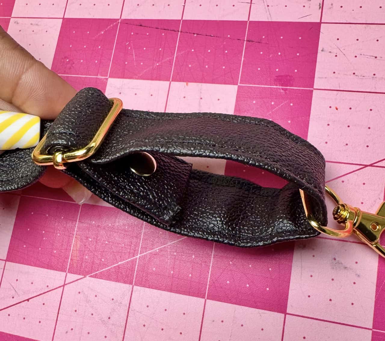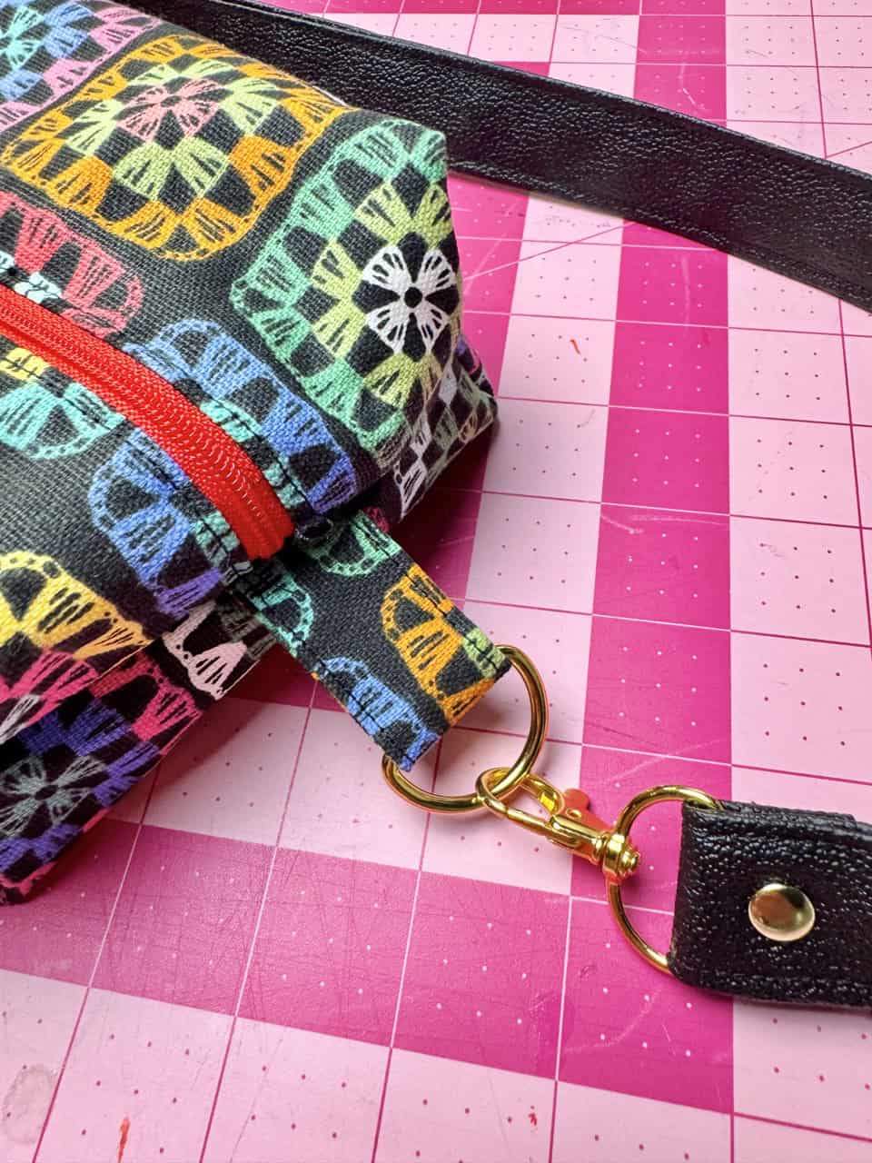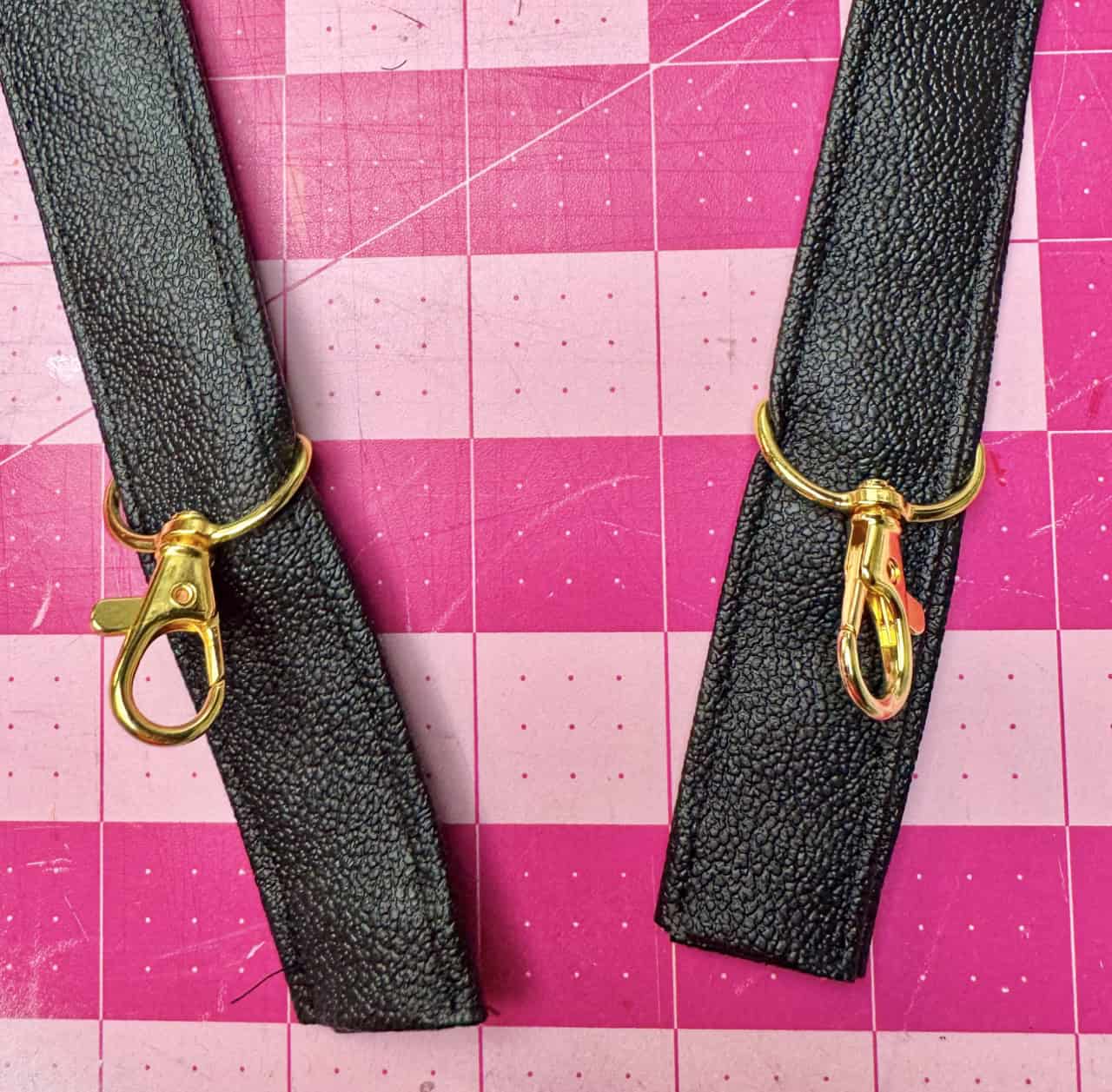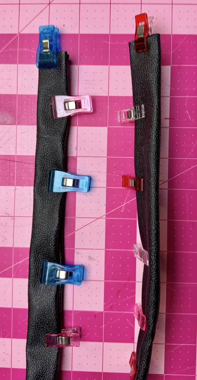 7) Make straps: Fold short ends under ½”. Fold long sides in by 1” and hold in place using the Clover Wonder Clips, then in half. Edgestitch both sides of the strap. Pass the strap through the slider, then through swivel hooks. Fold 1/2” of the end back and secure with stitching or a rivet. I made the holes for the rivet using an awl.