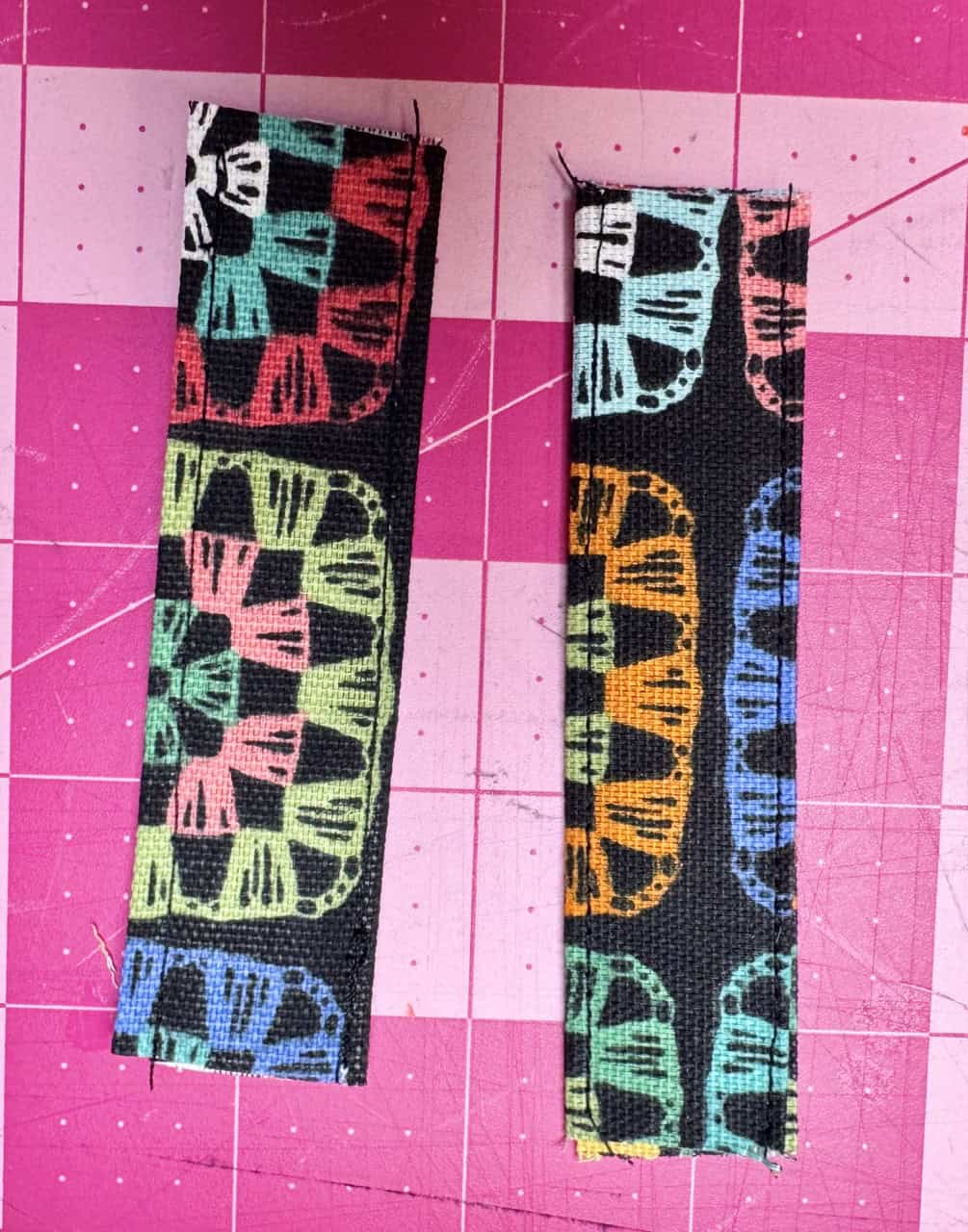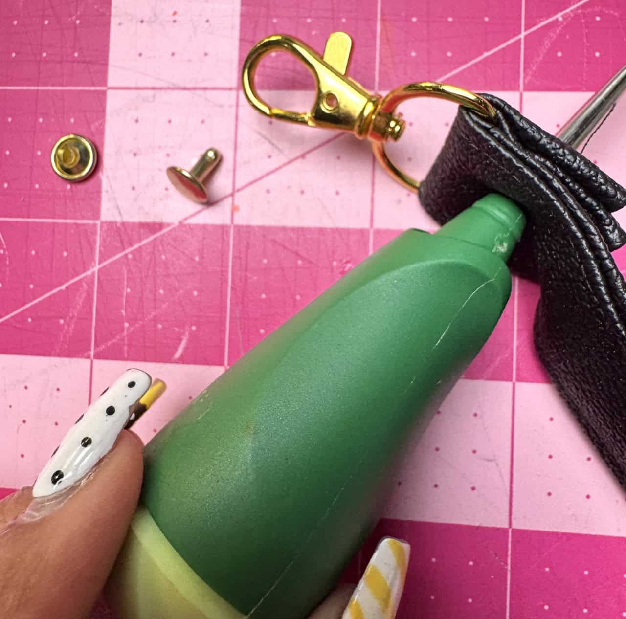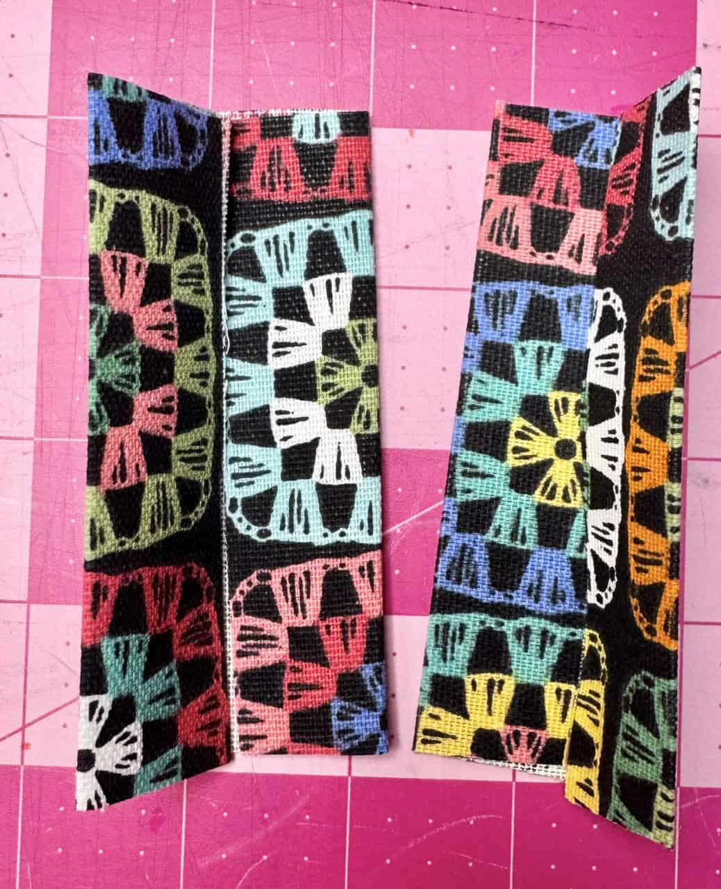 7) Make straps: Fold short ends under ½”. Fold long sides in by 1” and hold in place using the Clover Wonder Clips, then in half. Edgestitch both sides of the strap. Pass the strap through the slider, then through swivel hooks. Fold 1/2” of the end back and secure with stitching or a rivet. I made the holes for the rivet using an awl.