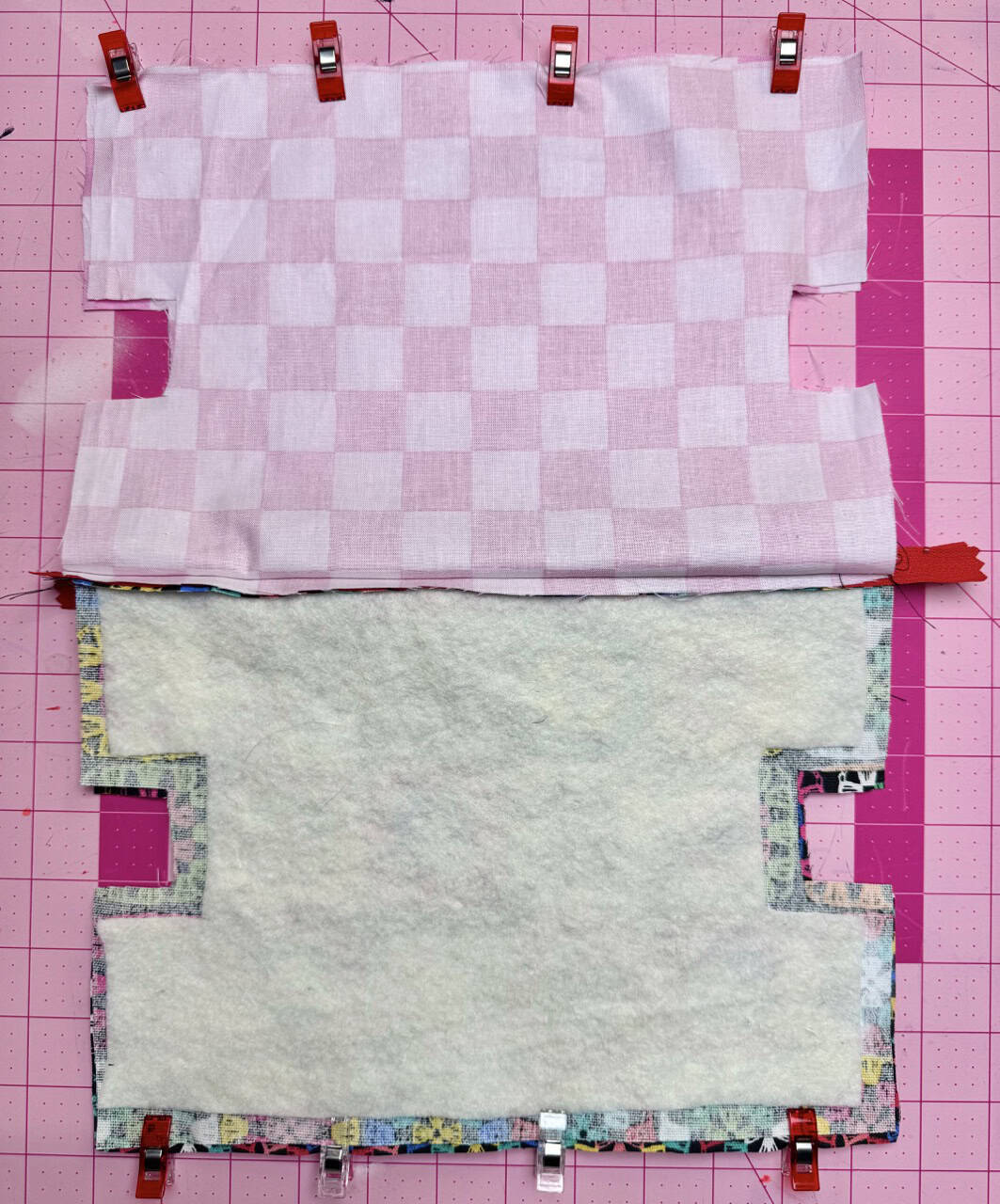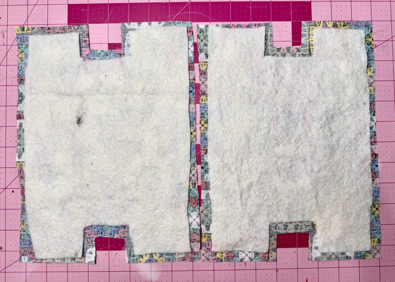 3) Prepare the body. Apply batting (2) to the bag body (1) pieces, using fusible adhesive to hold it in place.
