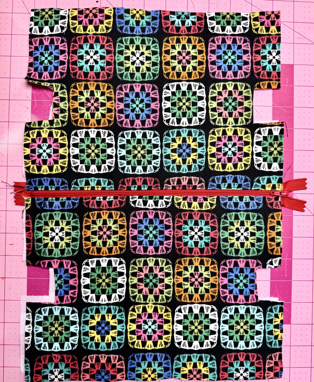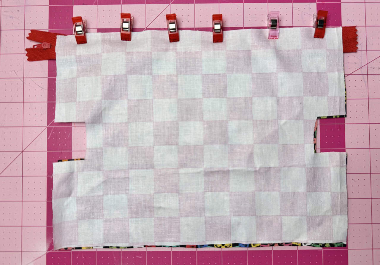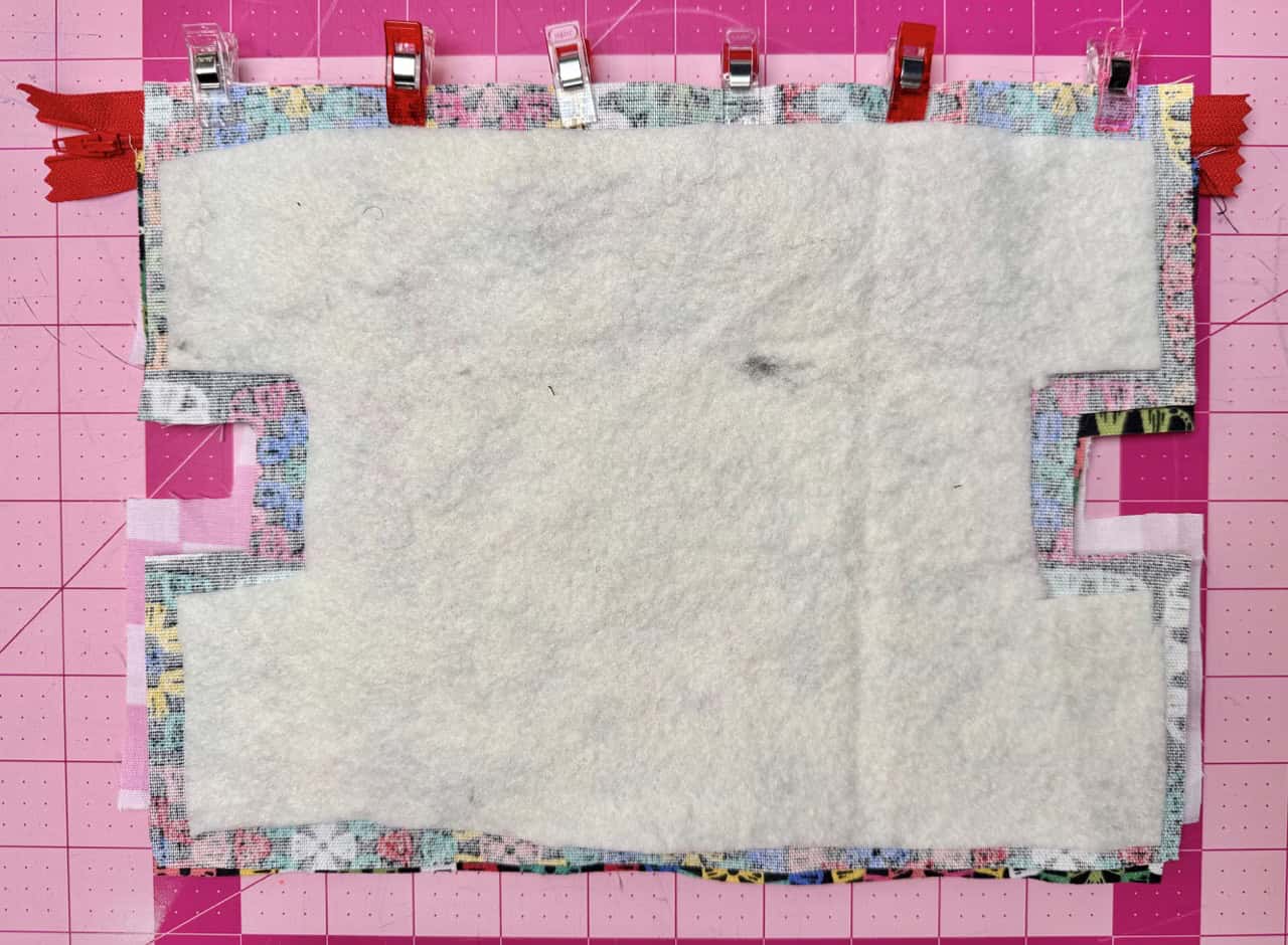 4) Install zipper. Layer outer fabric right side up with the zipper face down and the lining face down. Repeat on the other side of the zipper. Use Clover Wonder Clips to hold it in place. Sew with a zipper foot. Topstitch both sides of the zipper.