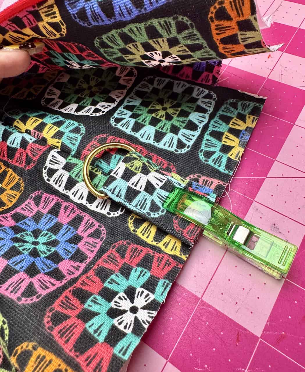 5) Sew sides: Unzip halfway. Place outer pieces right sides together and lining right sides together. Hold in place using Clover Wonder Clips. Sew each long side with a ¼” seam allowance. Turn bag and lining right sides out. Attach tabs with D-rings to both ends of the bag and baste in place with a 1/2” seam allowance. Pin to the bottom of the zipped end of the bag, centered across the seam with raw edges together and right sides together. Make sure the zipper is unzipped so that you can turn the bag right sides out. Sew ends: Stitch across with a ½” seam allowance, then trim to ¼”. Box corners by opening and flattening corners, sew with a ½” seam allowance, trim to ¼”.