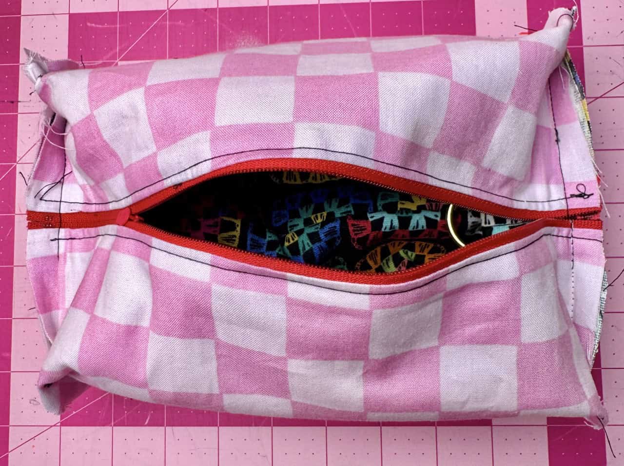 5) Sew sides: Unzip halfway. Place outer pieces right sides together and lining right sides together. Hold in place using Clover Wonder Clips. Sew each long side with a ¼” seam allowance. Turn bag and lining right sides out. Attach tabs with D-rings to both ends of the bag and baste in place with a 1/2” seam allowance. Pin to the bottom of the zipped end of the bag, centered across the seam with raw edges together and right sides together. Make sure the zipper is unzipped so that you can turn the bag right sides out. Sew ends: Stitch across with a ½” seam allowance, then trim to ¼”. Box corners by opening and flattening corners, sew with a ½” seam allowance, trim to ¼”.