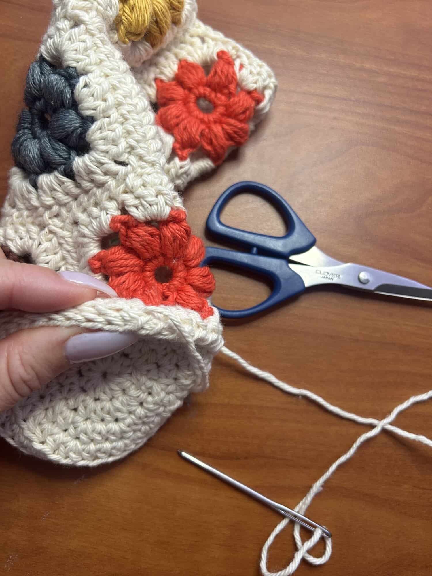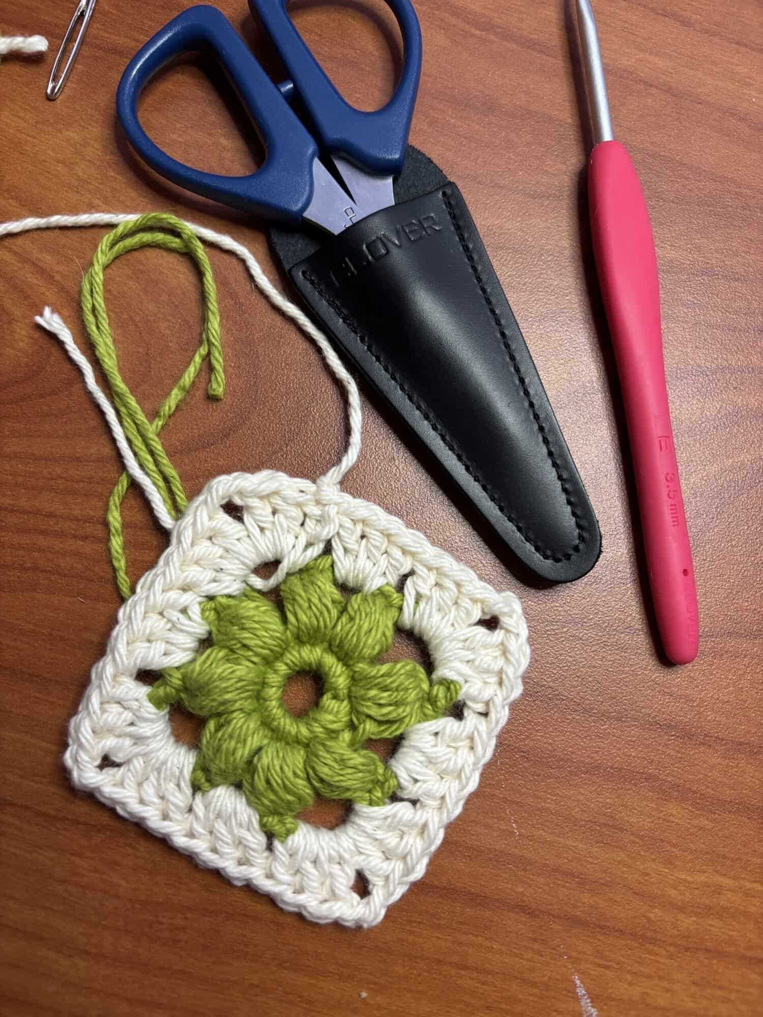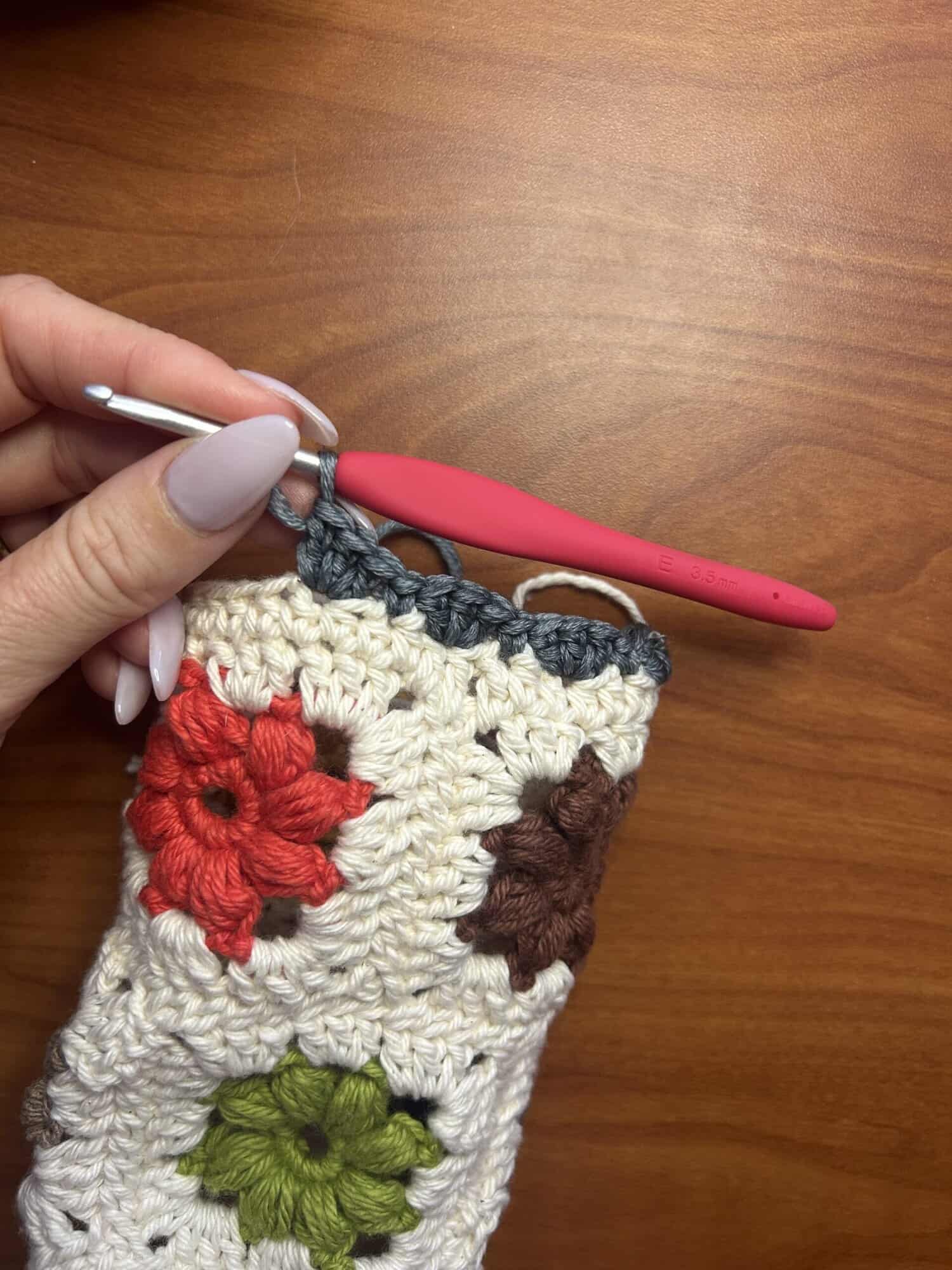 - Round 1: Ch 2, 1 hdc in each dc, place 1 dc in the corner space of the square, 1 dc in between the squares, 1 dc in the next corner sp, 1 hdc in the next 9 dc. Repeat around. Join with a sl st in the first hdc.