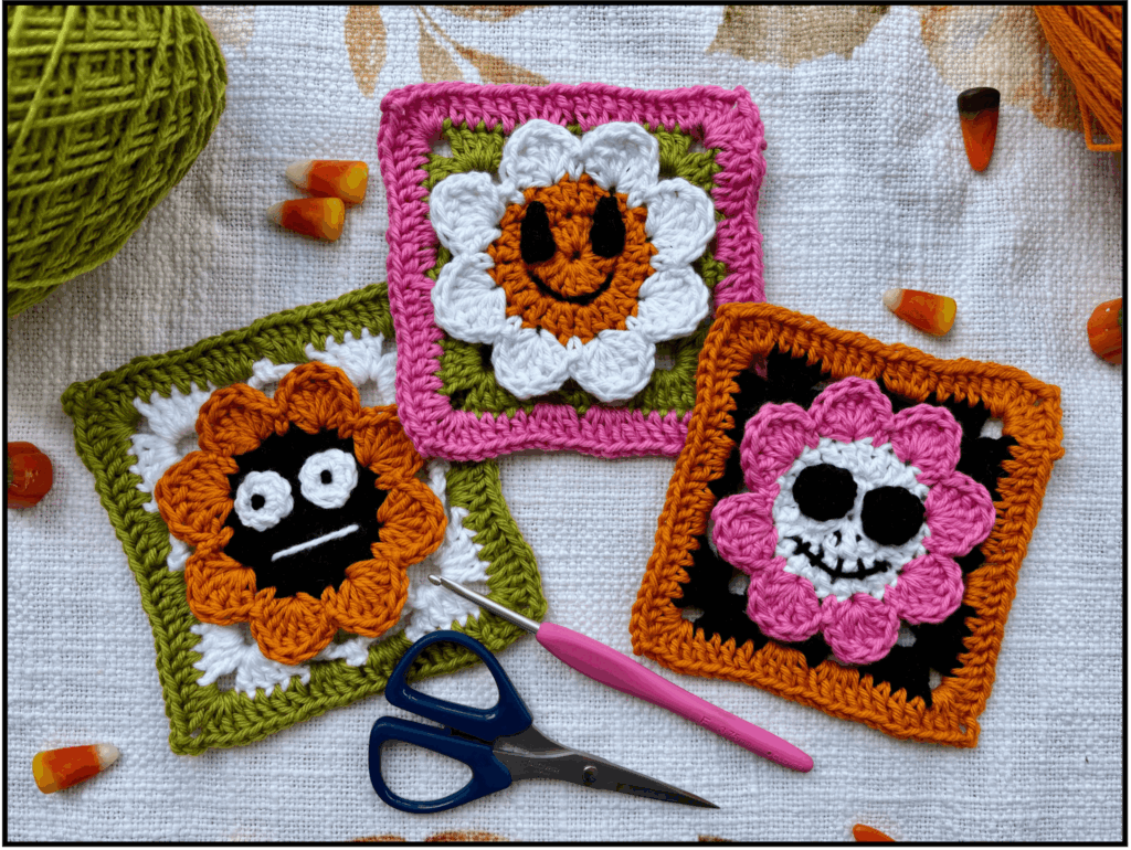 If you love flowers and Halloween as much as we do, you’re going to love these Boo-quet Squares. Think cheerful blooms with a spooky twist, perfect for adding some festive fun to your crochet projects this season. They work up quickly and are a great way to mix playful Halloween vibes with classic crochet charm! If you want to follow along to our YOUTUBE VIDEO TUTORIAL if you’re more of a visual learner, CLICK HERE!