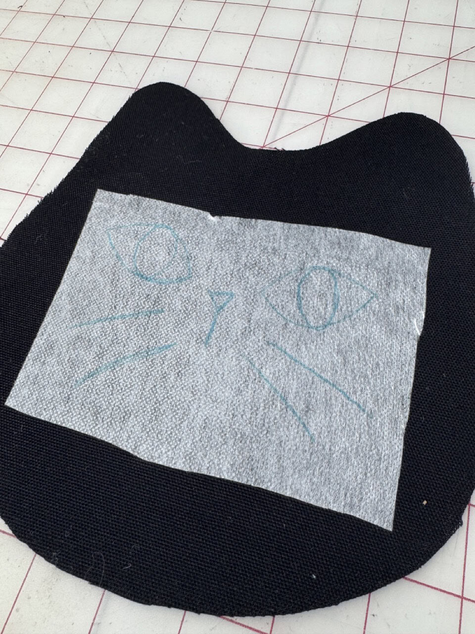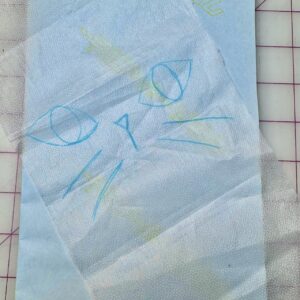 1) I found an image of a cat that I liked and I traced it. You can also freehand it! A circle and two triangles for ears would also suffice if you can’t find an image you would like to use. Feel free to use the pattern I provided in the materials! This is a great time to also trace the cat eyes, the cat nose, and cat whiskers onto the interfacing using the Clover Water Erasable Tracing Paper and Clover Double Tracing Tool.