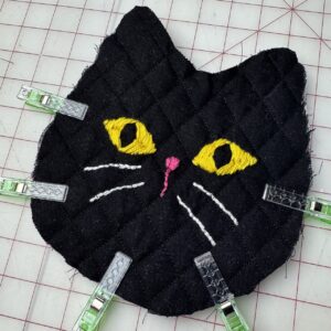 4) Sandwich the batting between both pieces of piece B. Add a quilt stitch to it. Add the double fold bias tape to the flat edge of piece B. Sandwich the batting between the black cat pieces. Then place piece B to the back of the piece A. Make sure all edges align neatly. Secure the layers with Clover Wonder Clips or Clover Flower Pins around the edges to prevent shifting while sewing.