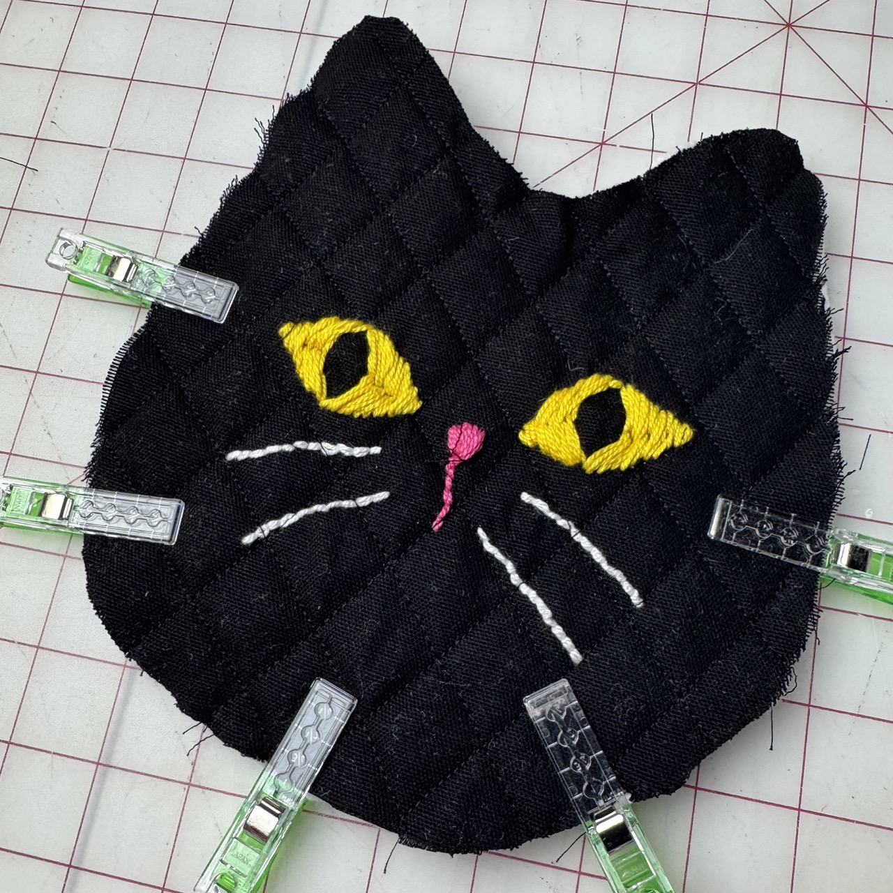 3) Before assembling, place the traced cat face onto the wrong side of one of the black cat pieces. Using Clover Embroidery Needles and Clover Darning Yarn, add the whiskers, the eyes, and the nose following the tracing guidelines. I used a backstitch to create the cat’s face. This adds both texture and a handmade touch.