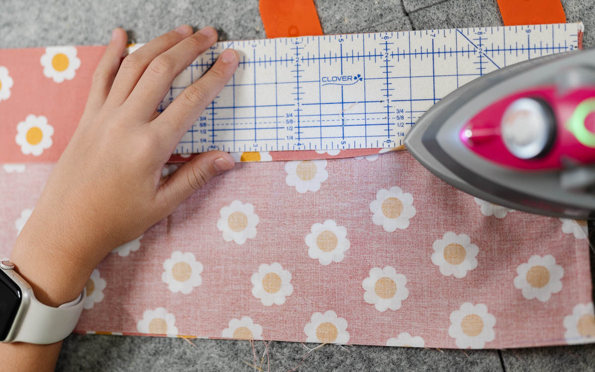 Then grab the inner fabric tube and repeat the same steps. Before attaching the base, she used her Hot Ruler to fold down 2½” from the top edge and pressed it in place. This fold became her guide for a small decorative touch — her signature buzzing bee.