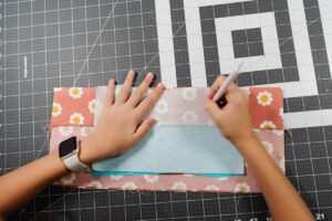 Using her Rotary Cutter and Hot Ruler, Cataleya cut both fabric rectangles (31½” × 9¼”) and two 10″ circles for the base.