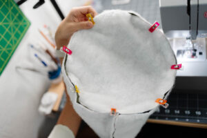Using her Magnet Pin Caddy to keep everything organized, she sewed carefully around the entire top rim.