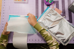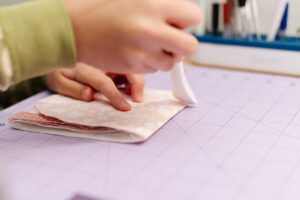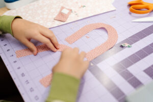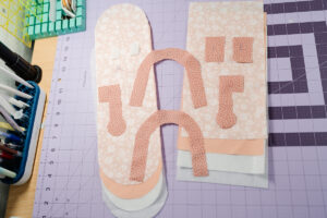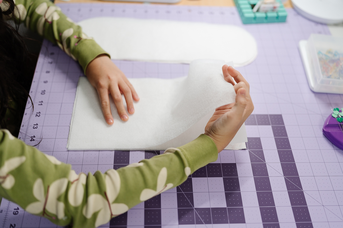 Let’s cut the fabric into the right shapes. You have to turn your long rectangle for Piece A into a pill shape with rounded ends using my Rotary Cutter.