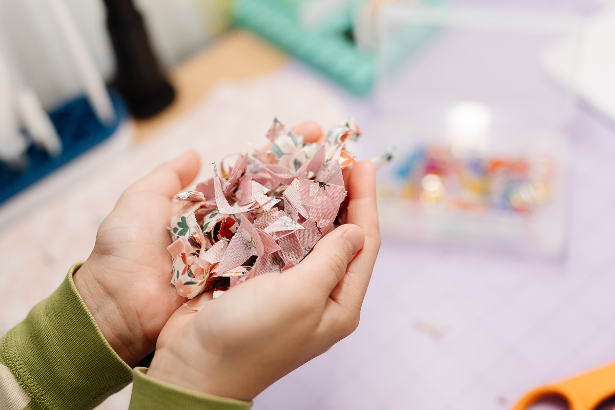 I got the idea from my mom. She told me that when she was little, her whole class would decorate old tissue boxes for Valentine’s Day. I wanted to make a version out of fabric that I can keep forever! I picked out the prettiest light pink fabric with white flowers for the outside, a solid pink for the lining, and a touch of pink polka dots for the details.
