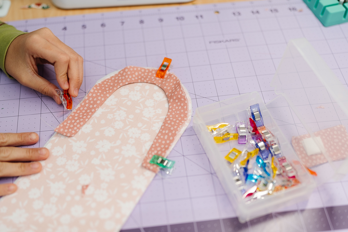 • The “Taco” Clip: Clip your floral Piece B rectangles to the curved edges of Piece A (over the trim).