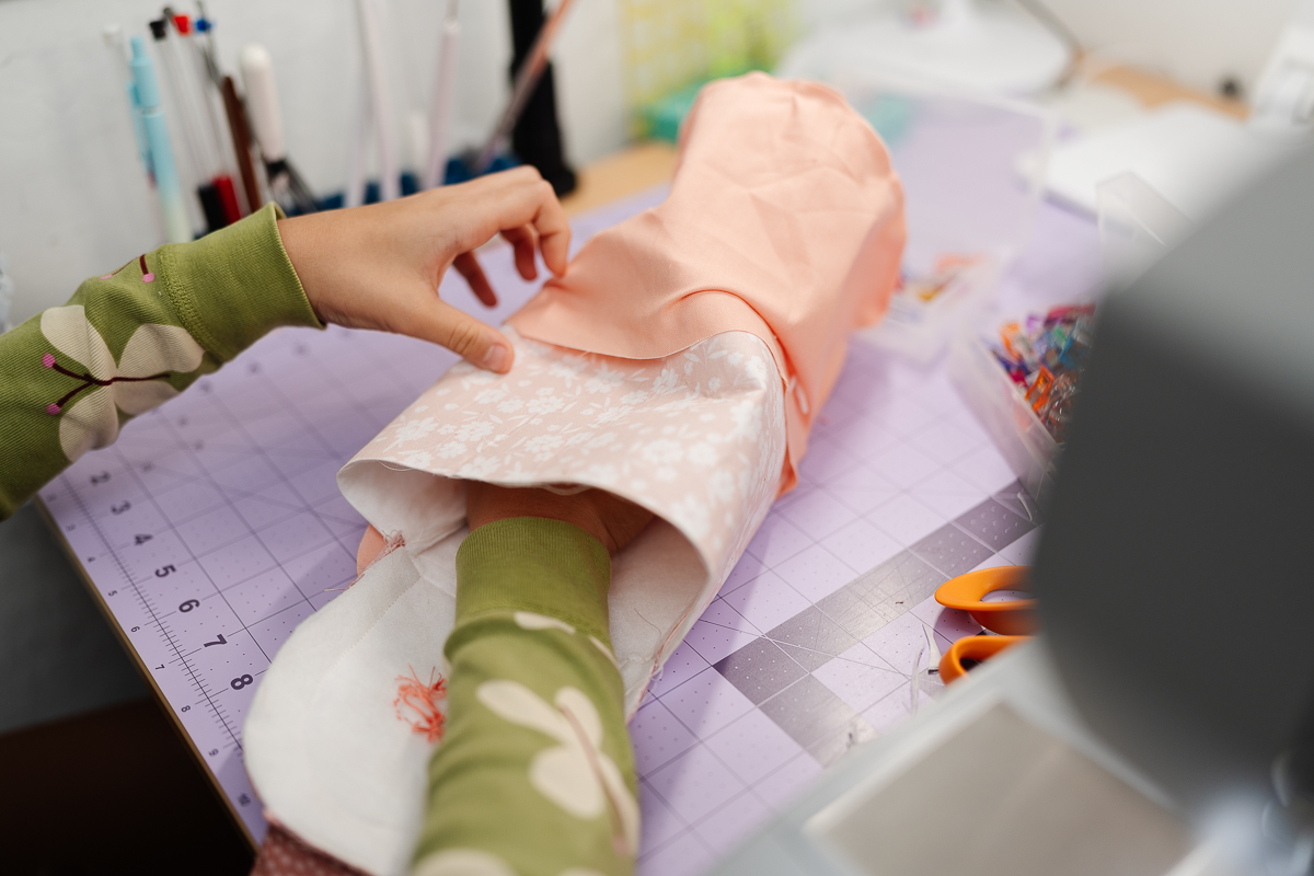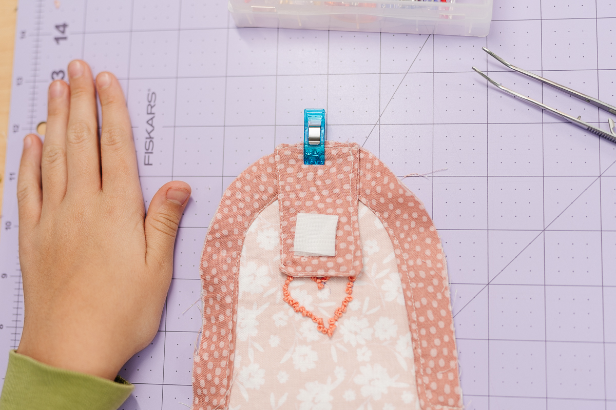 • Sewing the U: Put your two polka dot “U” pieces together (pretty sides touching!). Sew along the inside curve and the bottom edges only.