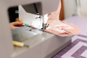 • Sewing: Put the two “L” pieces together (pretty sides touching). Sew all the way around, but leave a small gap at the bottom of the “L.” I heavily relied on my Metal Hera with a stylus to guide fabric pieces through the feed dogs.