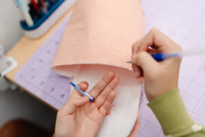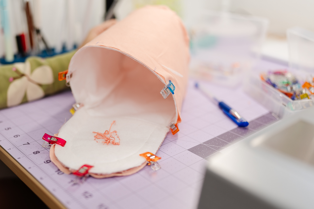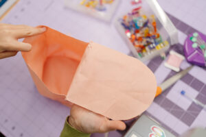 • Sew: Sew the curves slowly, then sew the bottom edge of Piece B to the straight sides of Piece A. Now it stands up!