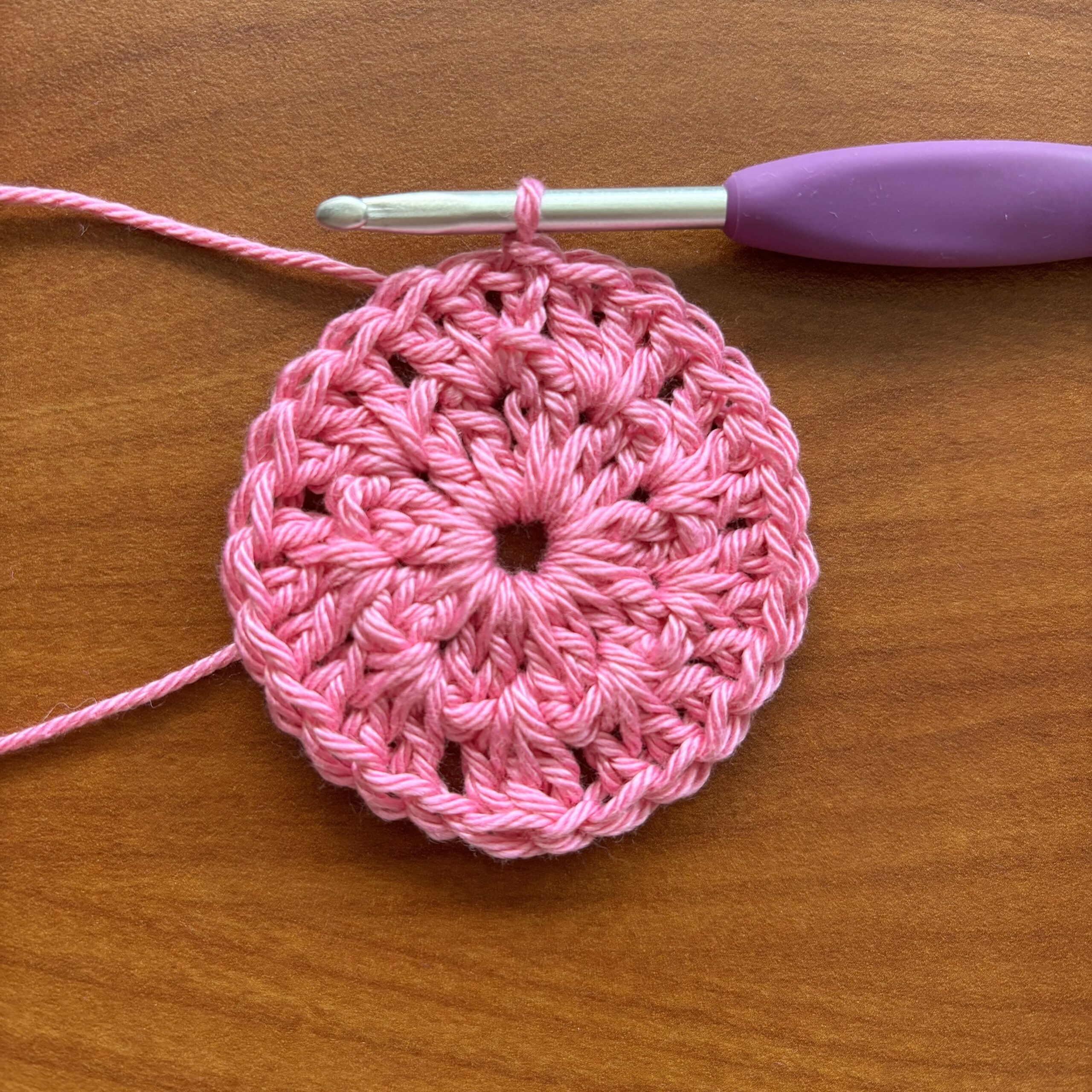 - Round 1: Ch 3 (counts as a dc), 17 dc in the circle. Join with a sl st in the top of the beginning ch 3. (18 sts)