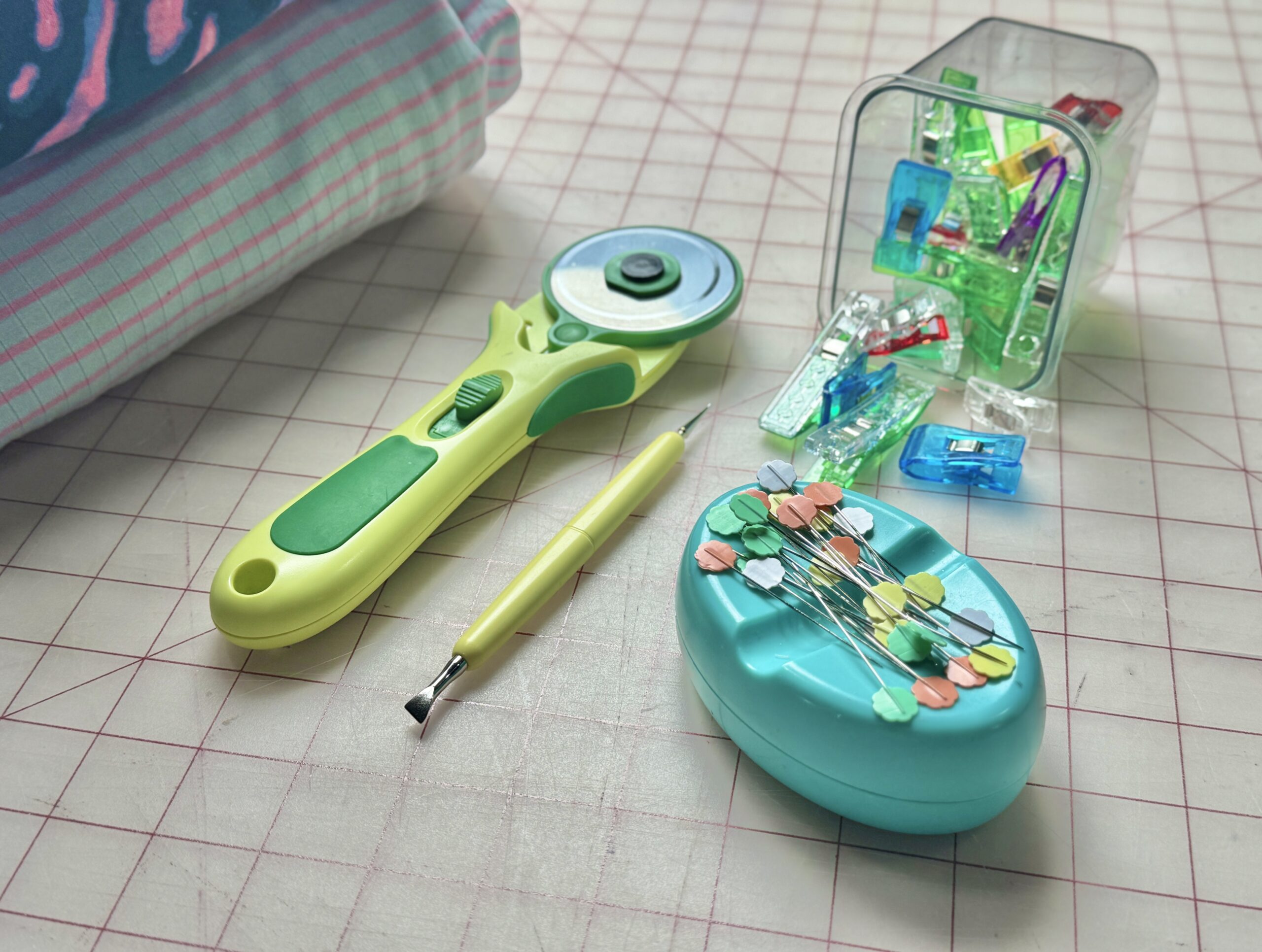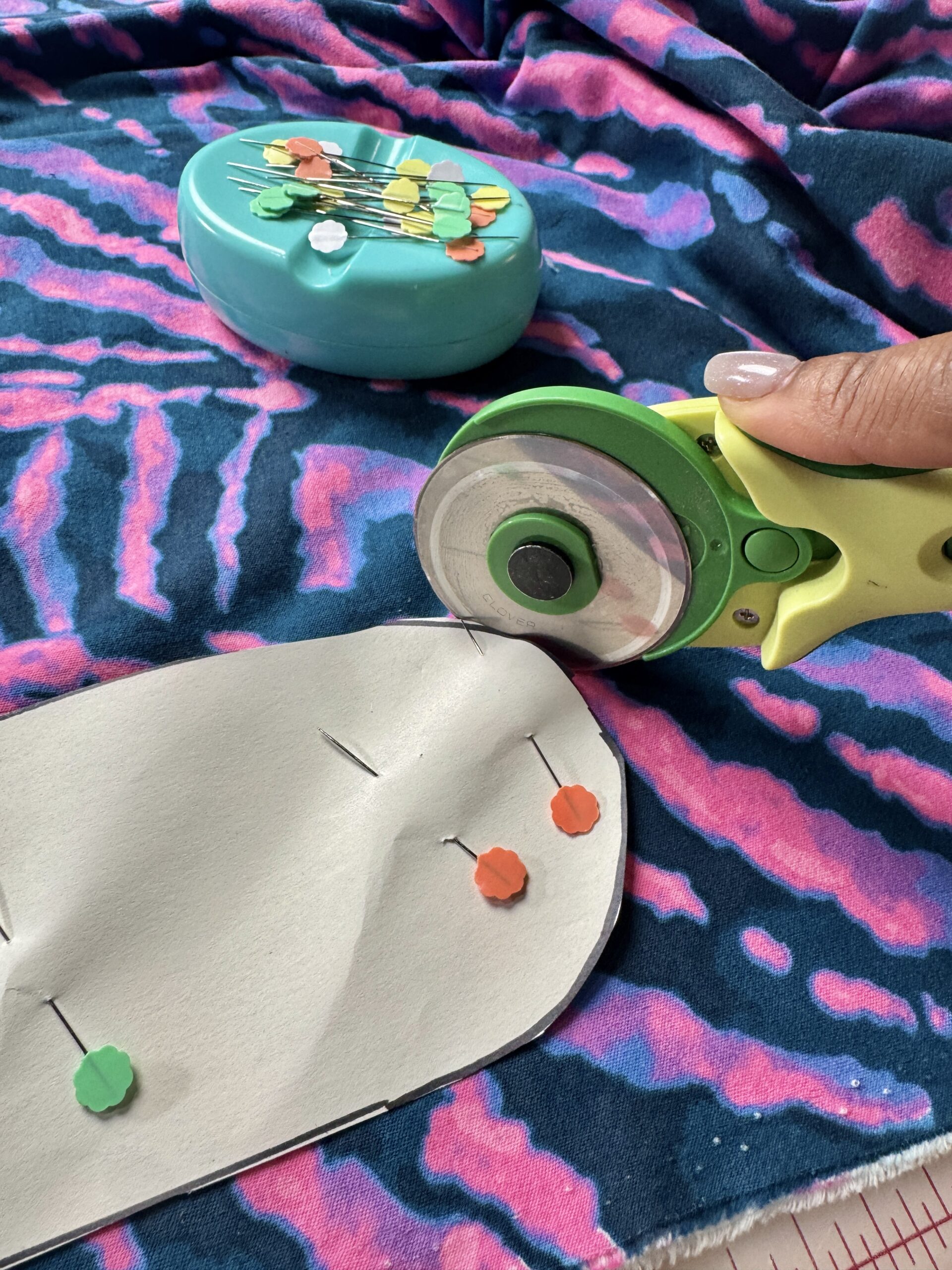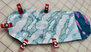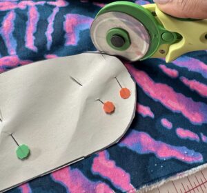 1) Cut the pattern out using the Clover Rotary Cutter (60 mm) I love using the Clover Flower Pins to hold pattern pieces in place. Place Back Bottom and Back Top RIGHT SIDES TOGETHER, matching the curved edge. Use Clover Wonder Clips to hold in place.