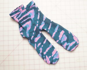 4) Fold Band in half WRONG SIDES TOGETHER. Divide Band and Sock opening into two equal parts and mark with pins or clips. With RIGHT SIDES TOGETHER, insert Sock Into Band, aligning raw edges. Pin or clip together. Sew, using your preferred stretch stitch. Repeat for other Sock.
