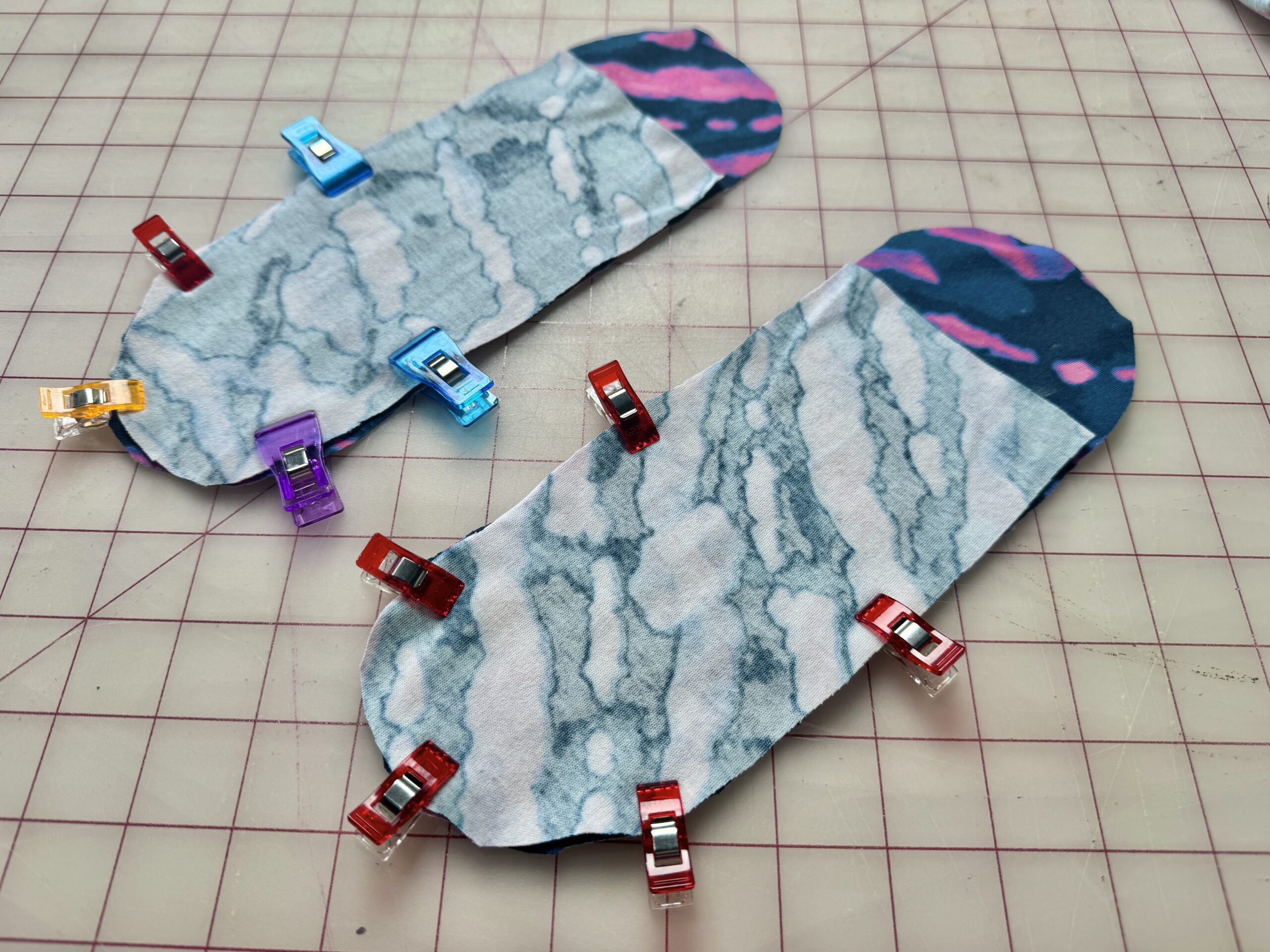 2) Sew between the notches, using a serger or zig-zag stitch. Open the Back piece, as shown, and place it RIGHT SIDES TOGETHER with the Front piece. Match the curved and flat edges, and pin or clip together, as shown. You will need to stretch the Back piece to fit the Front. This will help to eliminate fabric bunching at the heel. Sew, using a serger or zig zag stitch. Repeat steps for the other Sock.