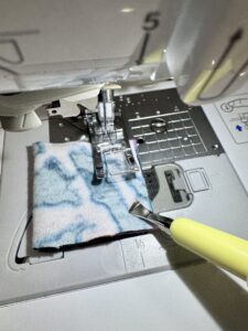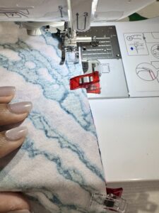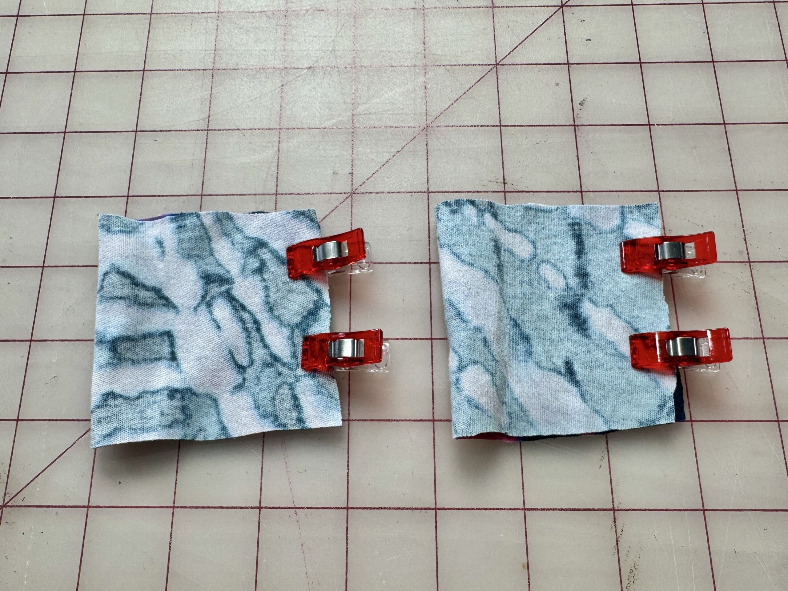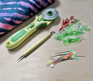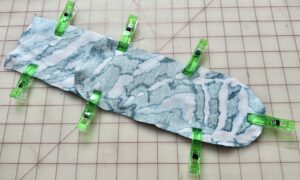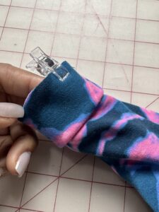 3) Fold Bands RIGHT SIDES TOGETHER and pin or clip the short, raw edge. I love using the Clover Metal Hera with Stylus when sewing smaller pieces. Sew, using a serger or zig-zag stitch.