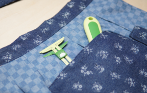 2) First, hem the apron body, leaving only one raw edge. I used the Clover 5-in-1 Sliding Gauge to mark the hem. Fold in the raw edge 1/2″ and press. Fold in again by 1/2″ and press. I used the Clover Wonder Clips to hold the hem in place. Sew the hem. The raw edge is where the straps will be placed.